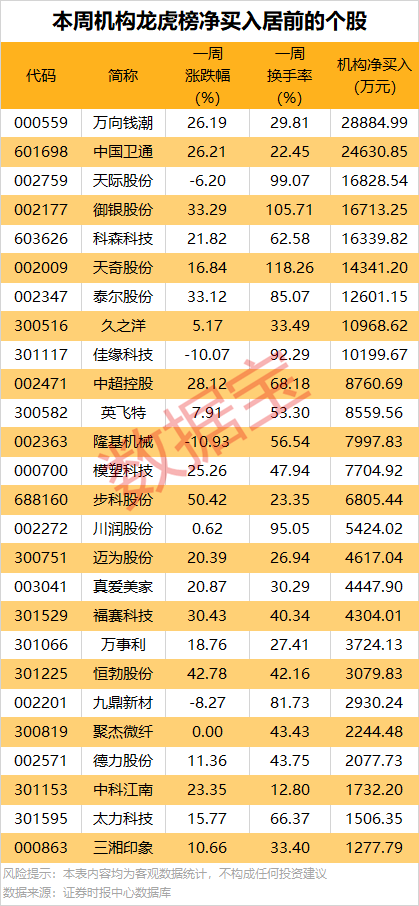 其中净卖出金额最多的是航天发展,本周累计上涨17.22%,一周换手率为99.59%,因日换手率达42.53%、日涨幅偏离值达10.31%、日涨幅偏离值达10.33%等3次上榜龙虎榜,买卖居前营业部中机构合计净卖出4.01亿元;同时上榜的还有深股通专用席位,净买入8.5亿元,营业部席位一周合计净买入1793.11万元。