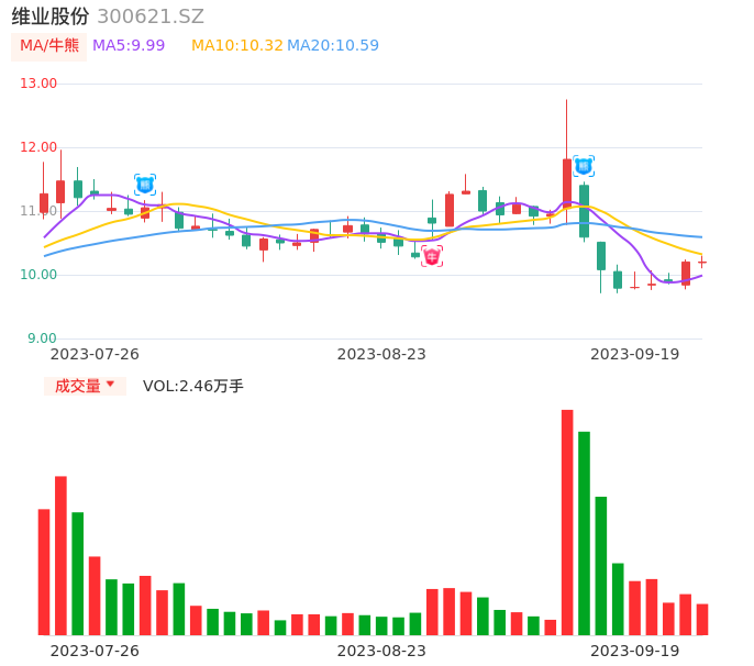 09月19日,维业股份收报10.20,股价涨幅0.00%,成交金额2507.71万元,换手率1.26%。