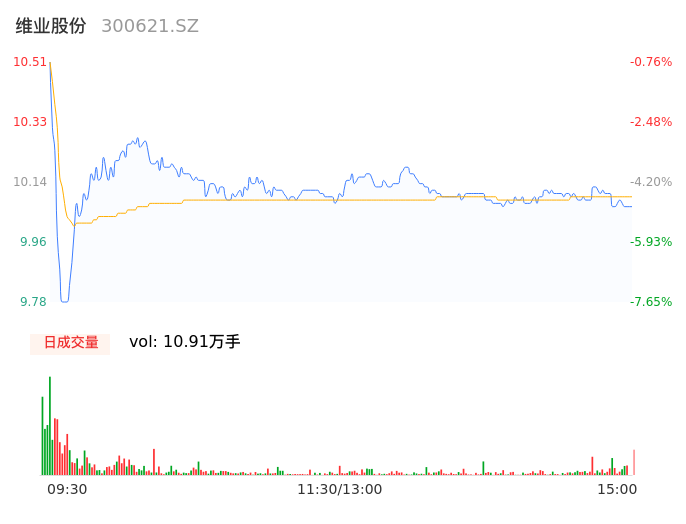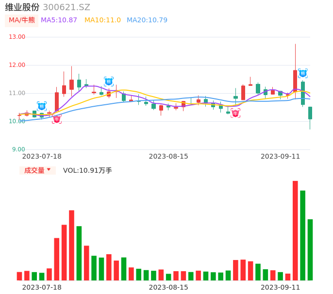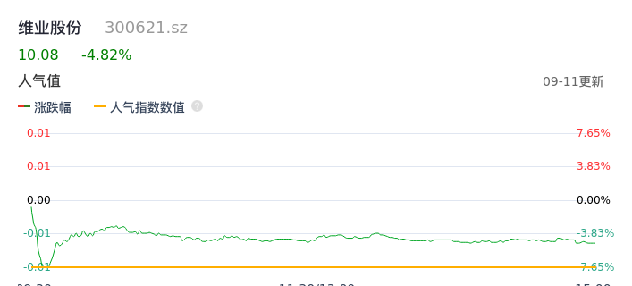 09月11日,维业股份收报10.08,股价涨幅-4.82%,成交金额1.10亿元,换手率5.56%。