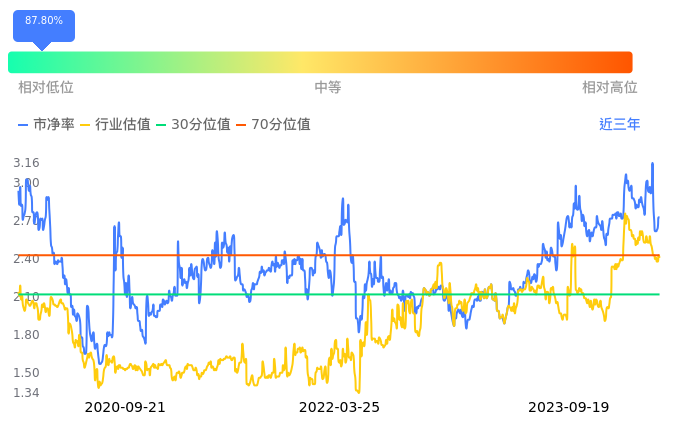 维业股份当前市净率PB为2.71,在所属的装修装饰中,市净率PB排13,前五名分别为亚厦股份市净率0.88、洪涛股份市净率0.93、金螳螂市净率0.93、中装建设市净率0.93、江河集团市净率1.32。维业股份当前市净率PB为2.71,超过近3年87.80%的历史数据。