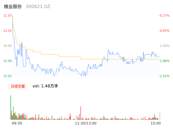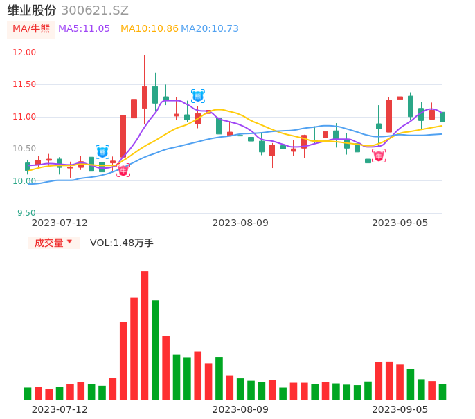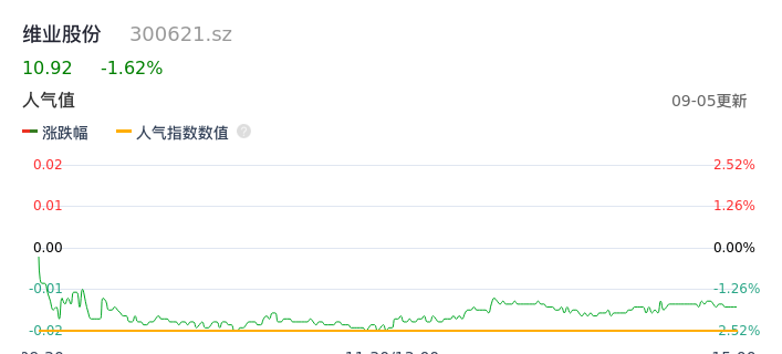 09月05日,维业股份收报10.92,股价涨幅-1.62%,成交金额1616.53万元,换手率0.76%。