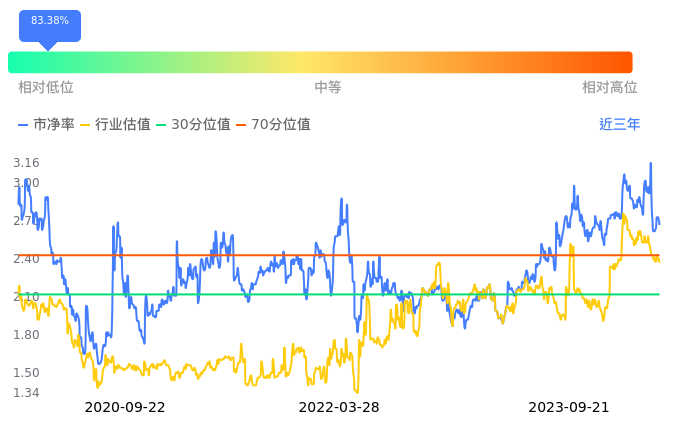 维业股份当前市净率PB为2.67,在所属的装修装饰中,市净率PB排12,前五名分别为亚厦股份市净率0.87、金螳螂市净率0.92、中装建设市净率0.93、洪涛股份市净率0.93、江河集团市净率1.31。维业股份当前市净率PB为2.67,超过近3年83.38%的历史数据。