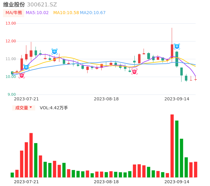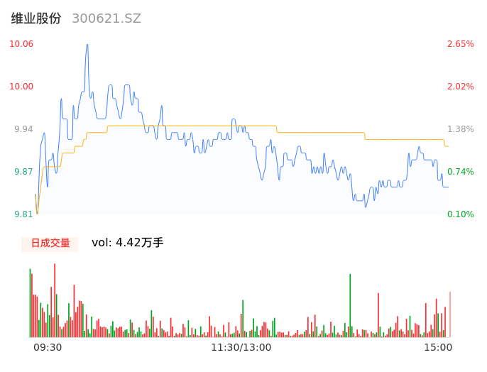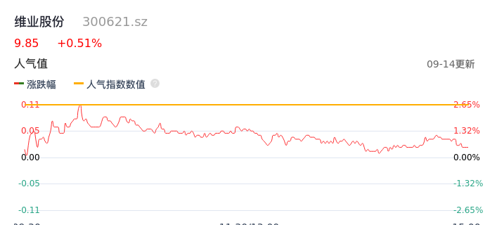 09月14日,维业股份收报9.85,股价涨幅0.51%,成交金额4384.11万元,换手率2.26%。