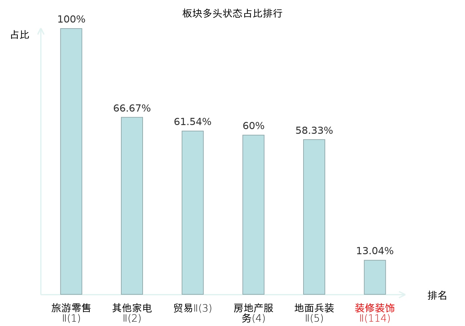 全市场所有行业板块中主力多头状态占比排名中,旅游零售Ⅱ板块位居第一。化妆品板块名次提升最快,较昨日上升62位。