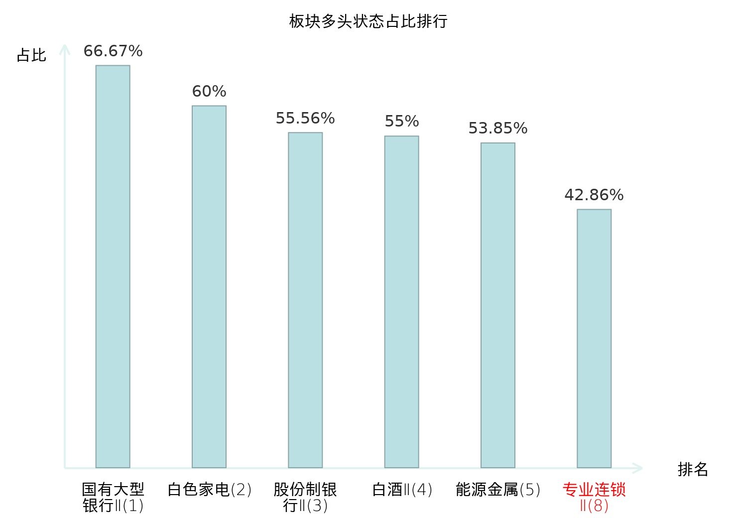 全市场所有行业板块中主力多头状态占比排名中,国有大型银行Ⅱ板块位居第一。林业Ⅱ板块名次提升最快,较昨日上升99位。