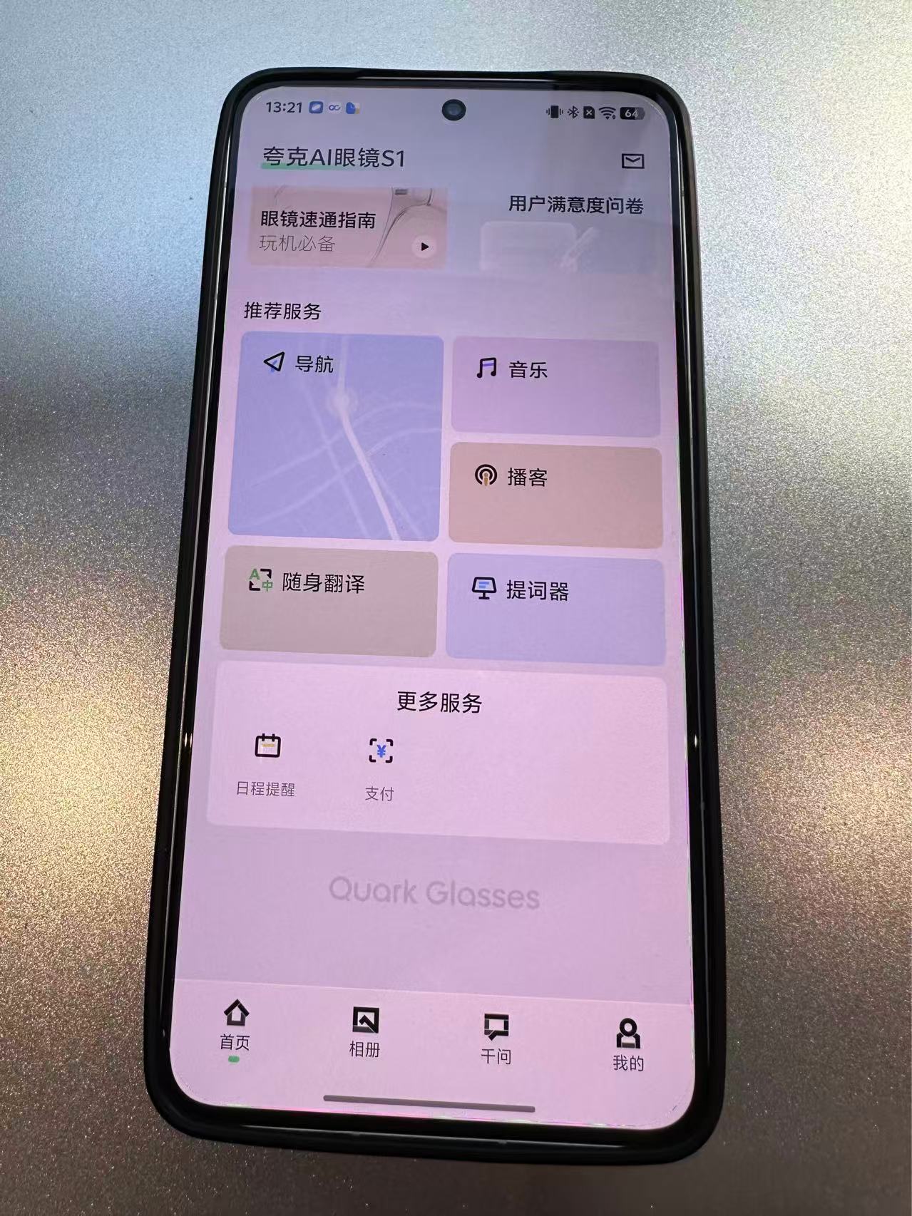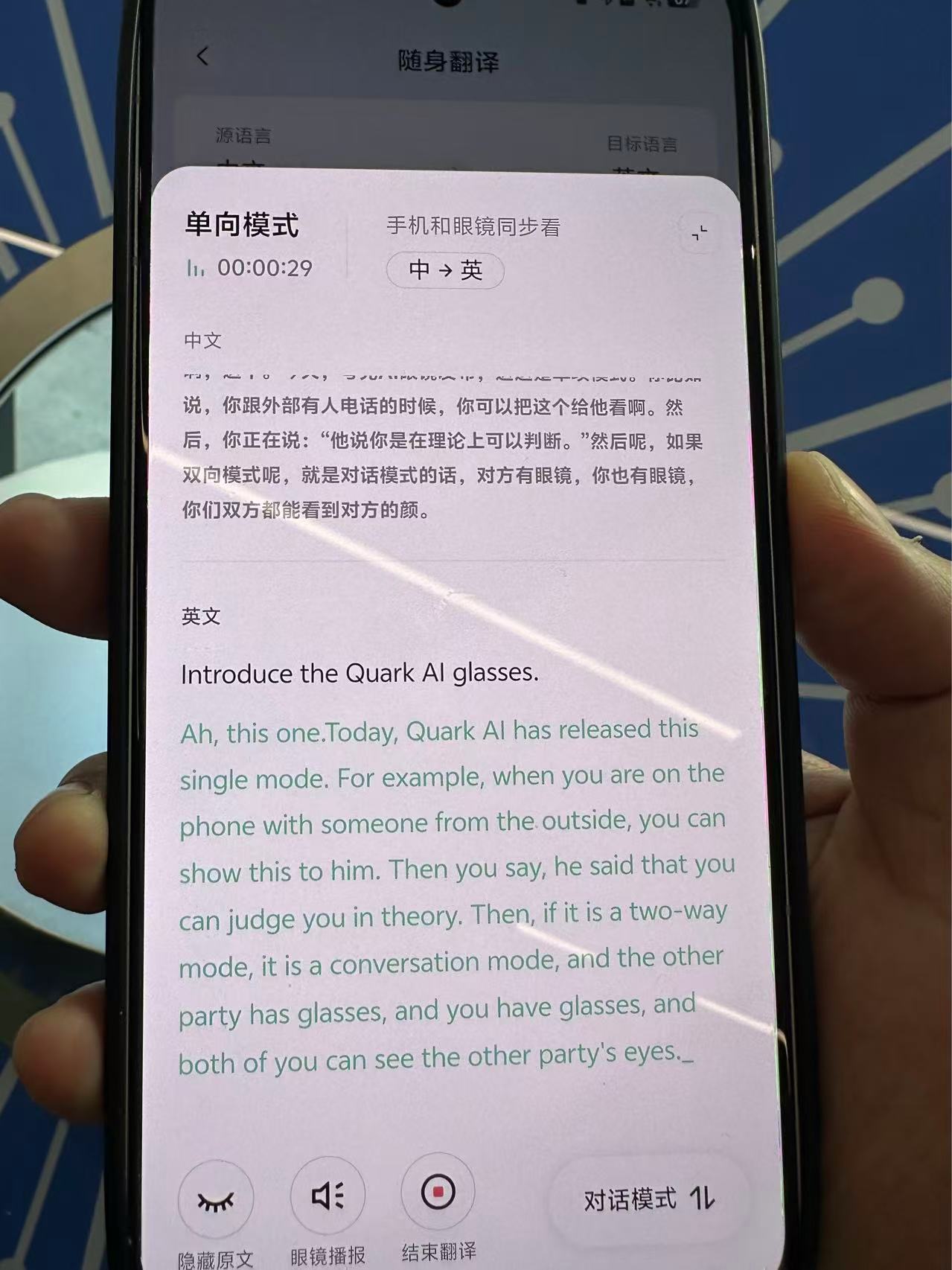 选择随身翻译功能后,夸克眼镜将启动实时翻译,译文同步显示于手机和眼镜屏幕,方便用户在跨语言交流中实时传递信息。
