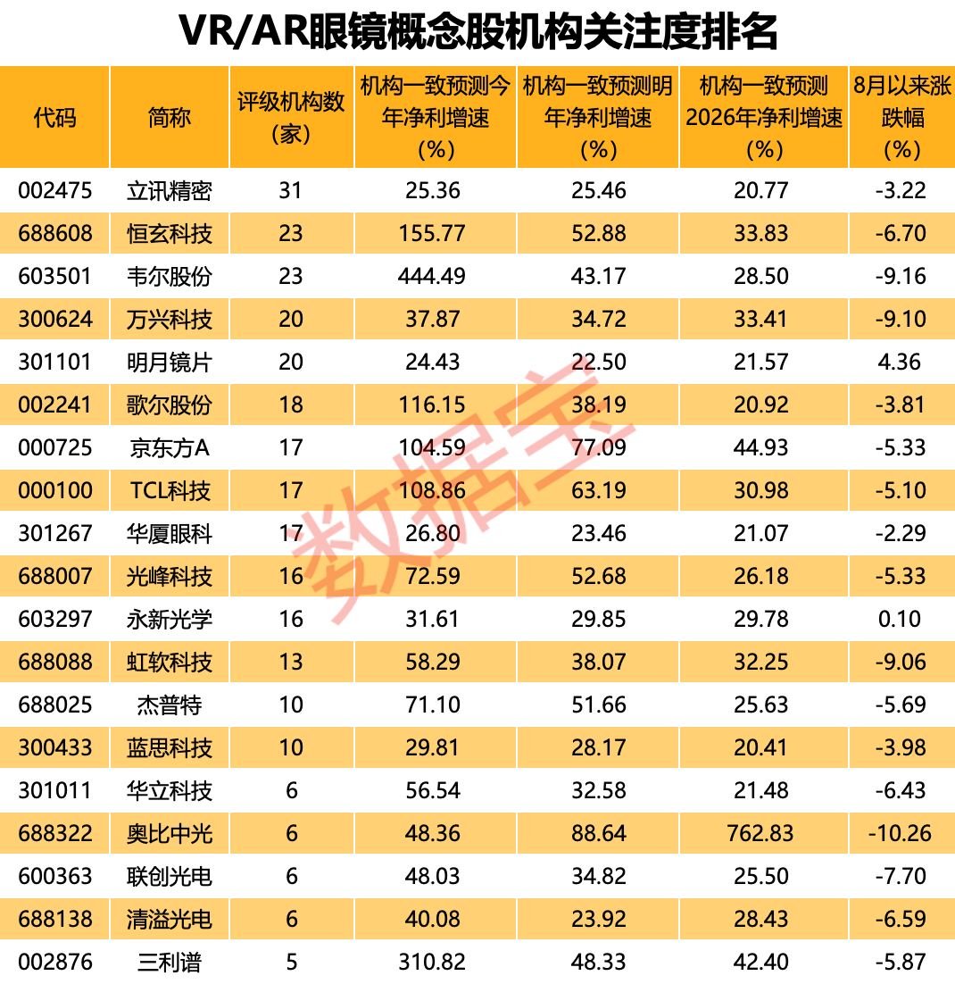 据证券时报·数据宝统计,从成长性来看,5家及以上机构评级的VR/AR眼镜概念股中,有19只机构一致预测今年、明年及2026年净利增速均超20%。