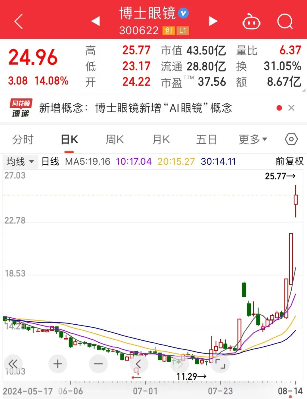 近期,AR眼镜概念表现较好,博士眼镜已经连续20cm涨停,今日早盘一度涨近18%。