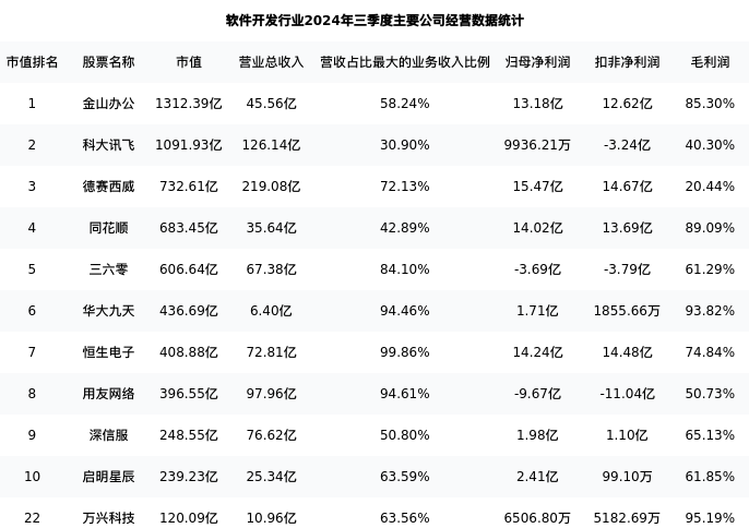 万兴科技最新报告期数据为三季度,下表汇总了软件开发行业内市值靠前的公司三季度主要经营数据