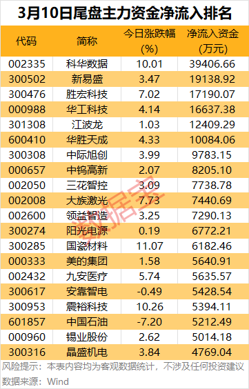 个股方面,6股尾盘主力资金净流入超1亿元,其中科华数据尾盘主力资金大幅净流入3.94亿元;新易盛、胜宏科技、华工科技、江波龙、华胜天成尾盘主力资金大幅净流入均超1亿元。