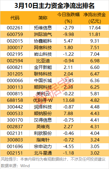 今日有32股主力资金净流出超2亿元,其中,拓维信息、洲际油气、协鑫能科、网宿科技、岩山科技等股净流出金额居前。