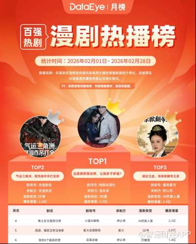 日前,AI漫剧《气运三角洲,我凭操作吊打全球》表现亮眼,仅用29小时突破2亿次播放,强势登顶春节档多个榜单。近日,DataEye研究院发布的2月漫剧热播百强榜中,《气运三角洲》再度上榜,以2.4亿次播放跻身月度Top2,夯实2026开年漫剧现象级爆品位置。