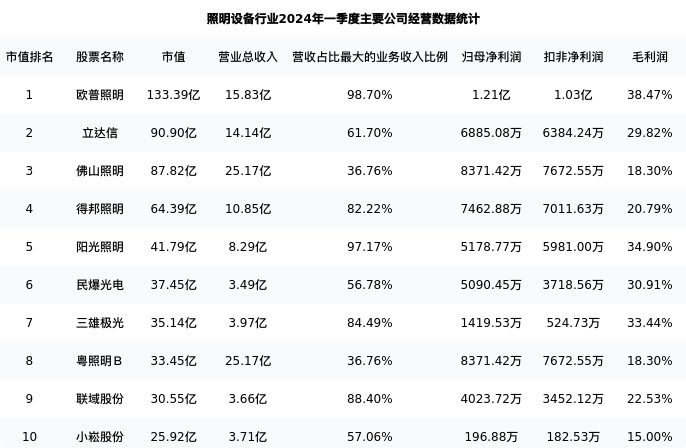 三雄极光最新报告期数据为一季度,下表汇总了照明设备行业内市值靠前的公司一季度主要经营数据