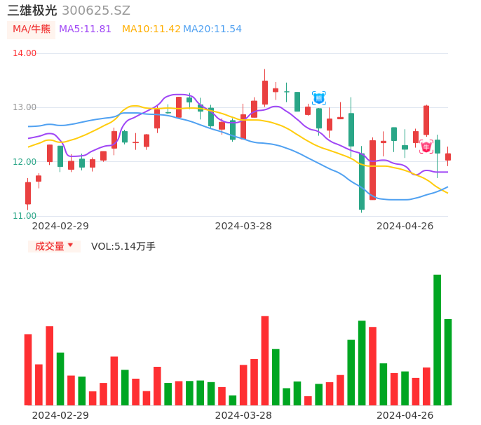 04月26日,三雄极光收报12.15,股价涨幅-0.08%,成交金额6230.29万元,换手率3.23%。