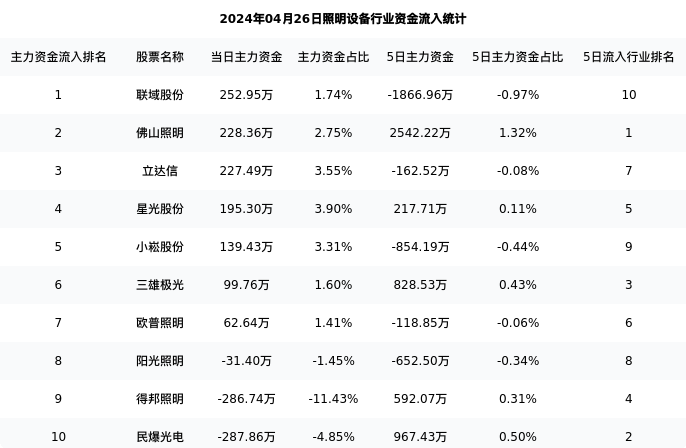 从主力资金流向来看,照明设备行业今日主力资金流入1.06亿元,在所有申万二级行业中排名:67/131。