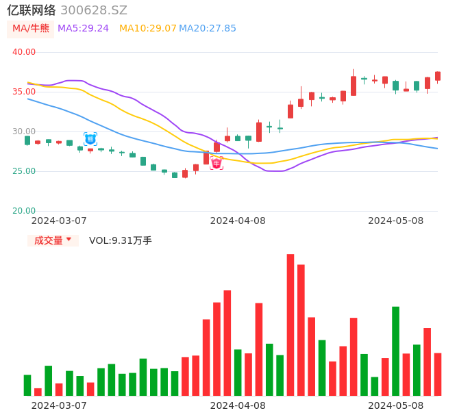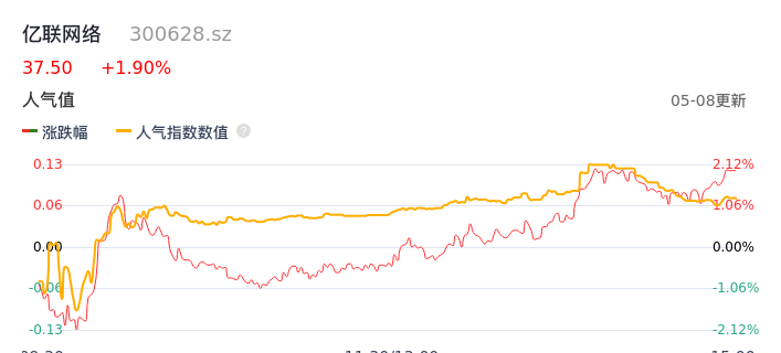 05月08日,亿联网络收报37.50,股价涨幅1.90%,成交金额3.44亿元,换手率1.29%。
