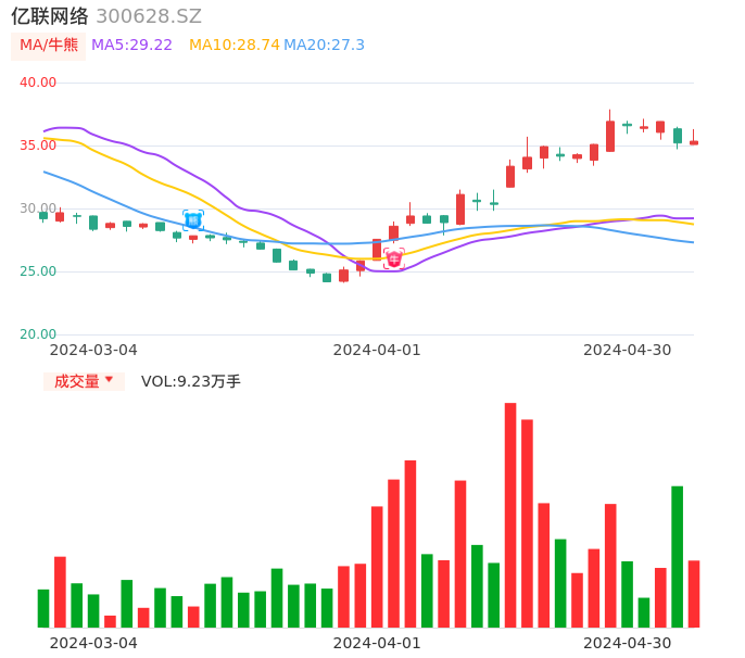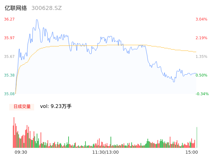 04月30日,亿联网络收报35.34,股价涨幅0.40%,成交金额3.30亿元,换手率1.28%。