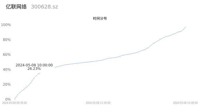 首先我们来看当日成交的时间分布。将今日交易时间按照5分钟的时间间隔进行切片,并绘制分布直方图进行观察。可以发现,10点之前的成交量占全天成交量的26.23%,这说明,该股票活跃时段换手率一般,资金热度较一般。