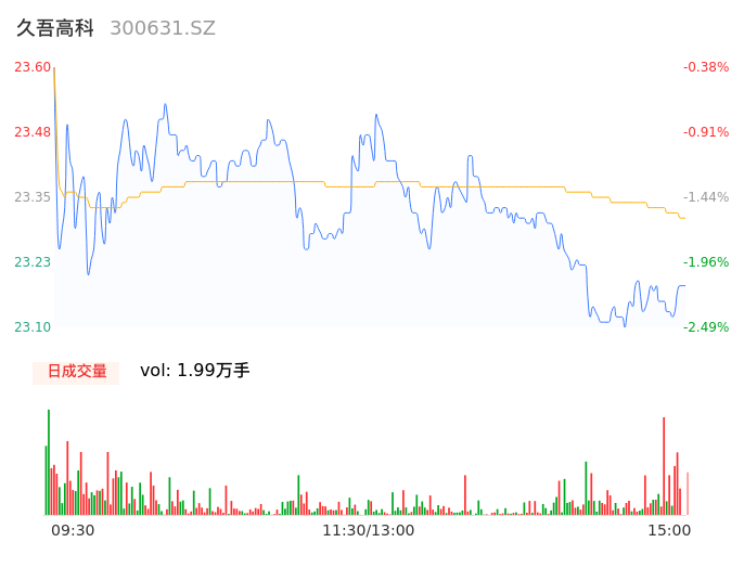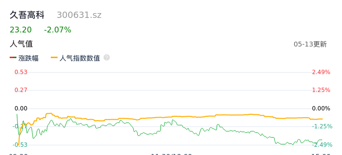05月13日,久吾高科收报23.20,股价涨幅-2.07%,成交金额4633.52万元,换手率1.64%。