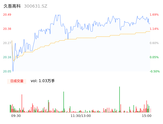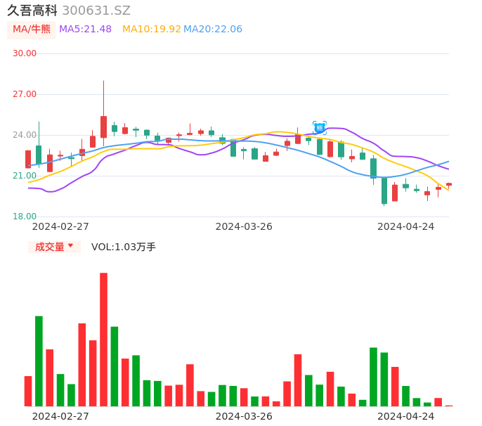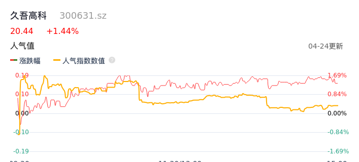 04月24日,久吾高科收报20.44,股价涨幅1.44%,成交金额2098.50万元,换手率0.85%。