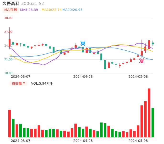 05月08日,久吾高科收报24.31,股价涨幅-3.30%,成交金额1.45亿元,换手率4.91%。