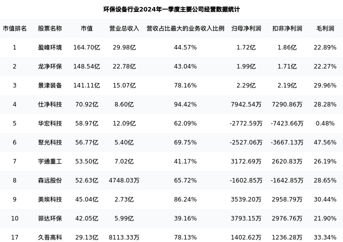 久吾高科最新报告期数据为一季度,下表汇总了环保设备行业内市值靠前的公司一季度主要经营数据