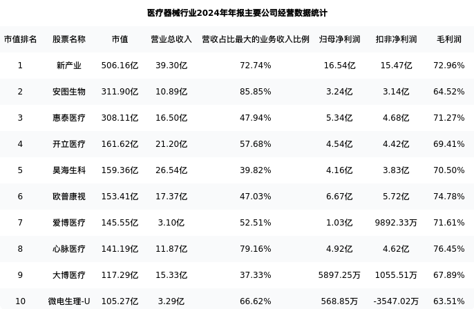 开立医疗最新报告期数据为年报,下表汇总了医疗器械行业内市值靠前的公司年报主要经营数据
