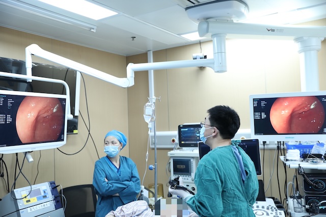 “偏远地区的内镜诊断能力,水平参差不齐,聚谱成像作为特殊光染色技术,不需要喷洒染色剂,功能内置于内镜操作手柄之上,仅需按一个按钮即可从白光成像切换至聚谱成像技术特殊光成像模式,让病灶轮廓更加清晰,也降低了操作难度和对临床经验的依赖度,为前沿技术在基层医院的普及提供了可能。”李晓波说。