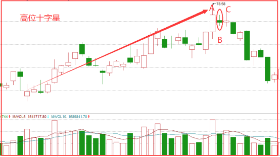 但是在A股创出新高之后,第二天出现一个阴十字星K线,但是由于他的收盘价在前一天阳线一半附近,因此还不好现在就下结论说市场要下跌,随后第三天C点依旧出现十字星,这已经是属于高危滞涨。