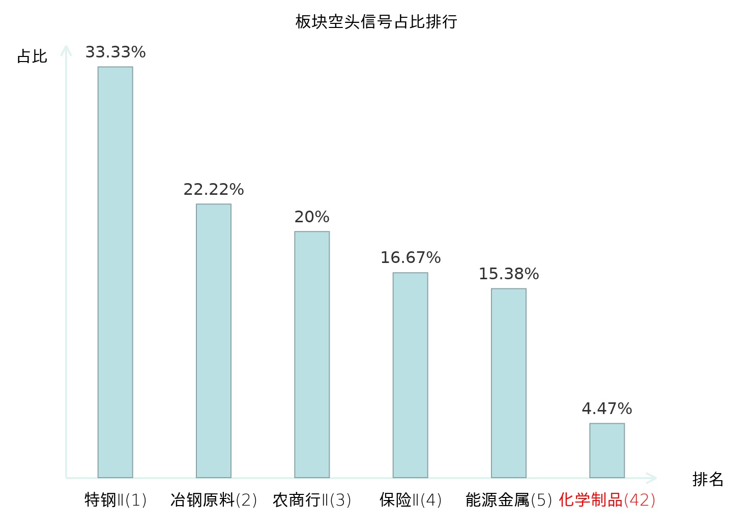 全市场所有行业板块中主力空头信号占比排名中,特钢Ⅱ板块位居第一。其他电子Ⅱ板块名次提升最快,较昨日上升117位。