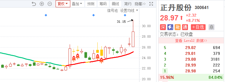 周一晚上的龙虎榜,给大家讲过年报预增的正丹股份,今天盘中涨了16%,逻辑非常简单,底部持续放量,股价又没有大幅拉升,四维操盘信号发出过四个小火箭信号,这说明主力已经进入,等待一个消息拉升。正丹股份年报预增100多倍的消息一出,自然就爆发了。