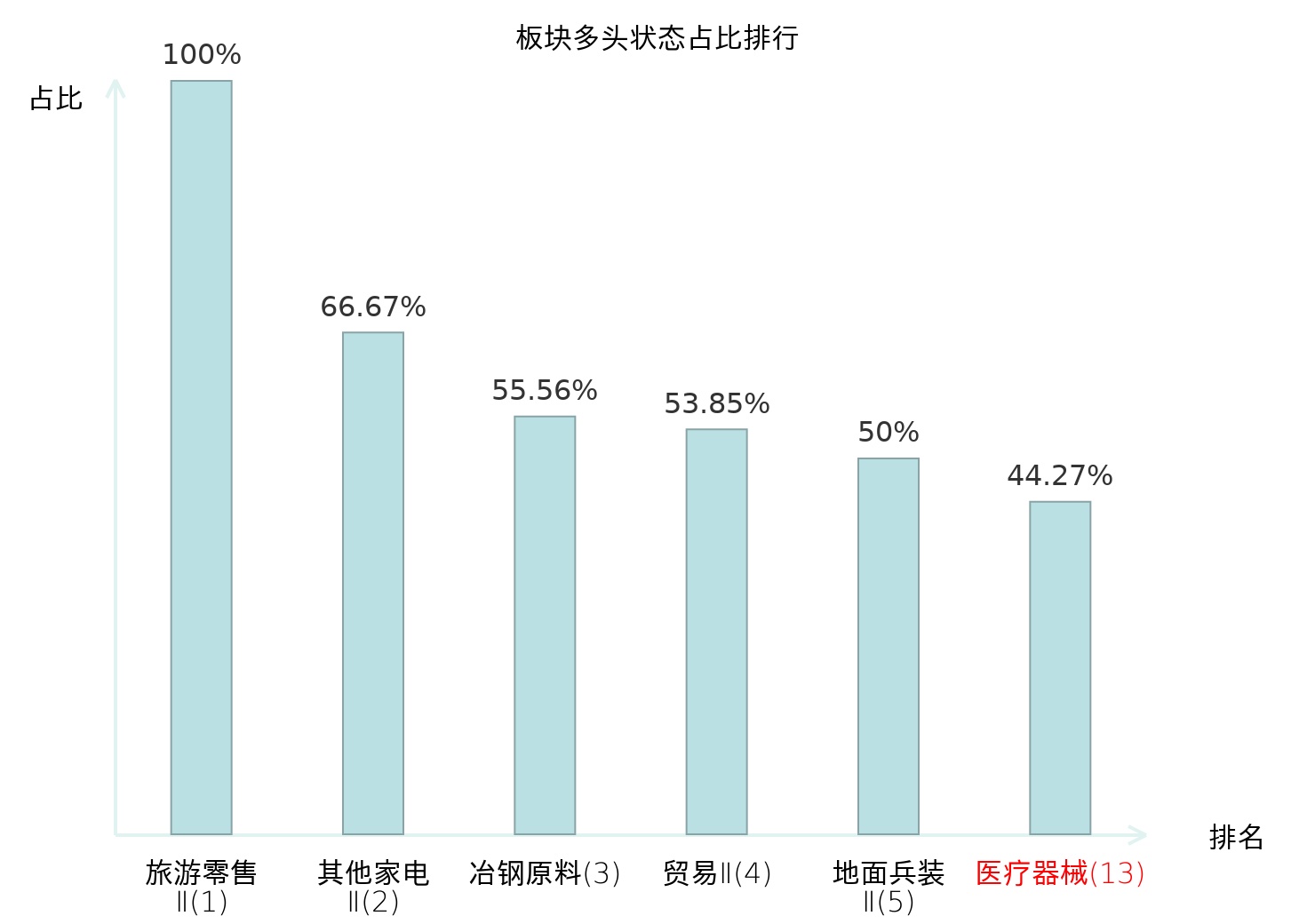 全市场所有行业板块中主力多头状态占比排名中,旅游零售Ⅱ板块位居第一。房屋建设Ⅱ板块名次提升最快,较昨日上升58位。