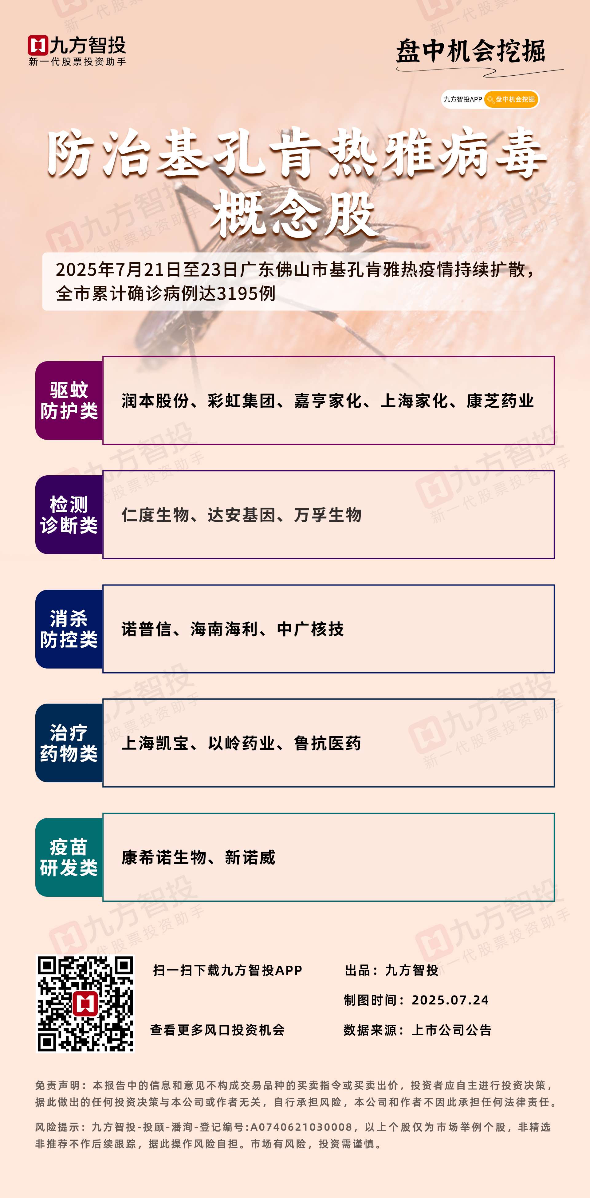 基孔肯雅热:世界卫生组织专家22日就蚊媒传播疾病基孔肯雅热发出警报,提醒各国做好应对准备,避免疫情大规模暴发,相关个股有嘉亨家化、透景生命、华业香料、润本股份、彩虹集团、佛慈制药等。