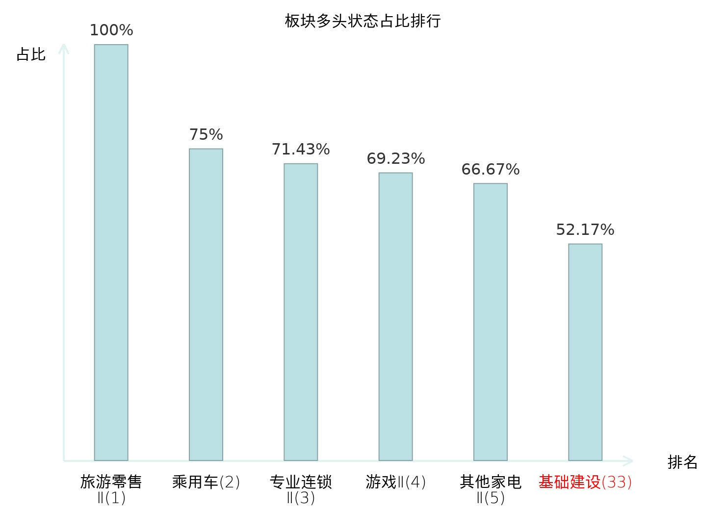 全市场所有行业板块中主力多头状态占比排名中,旅游零售Ⅱ板块位居第一。保险Ⅱ板块名次提升最快,较昨日上升82位。