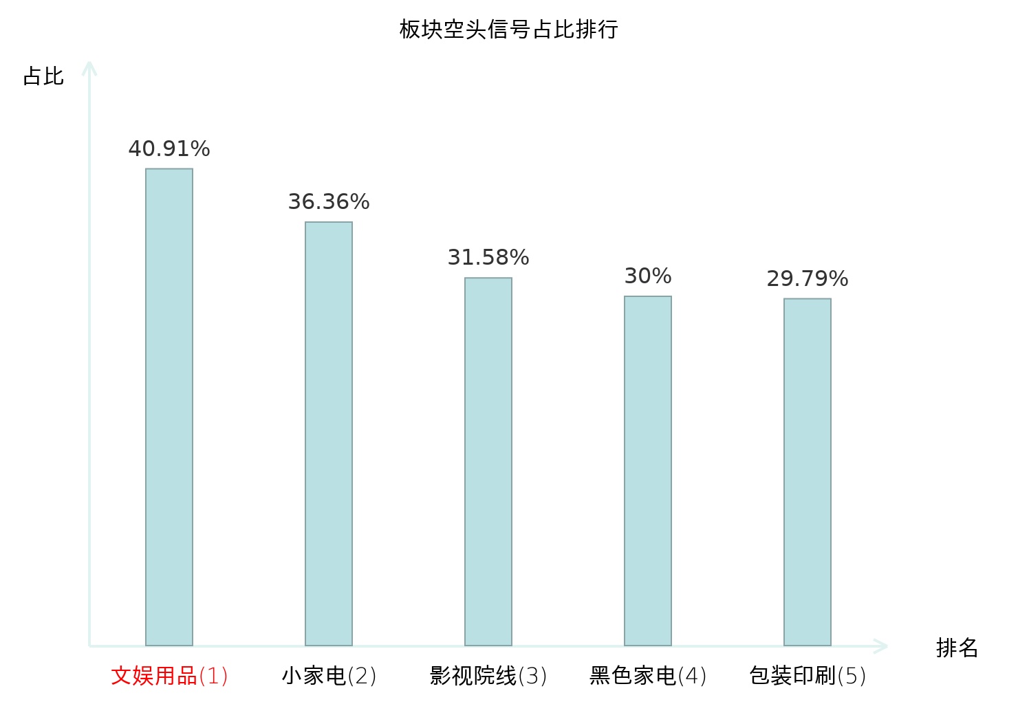 全市场所有行业板块中主力空头信号占比排名中,文娱用品板块位居第一。包装印刷板块名次提升最快,较昨日上升124位。