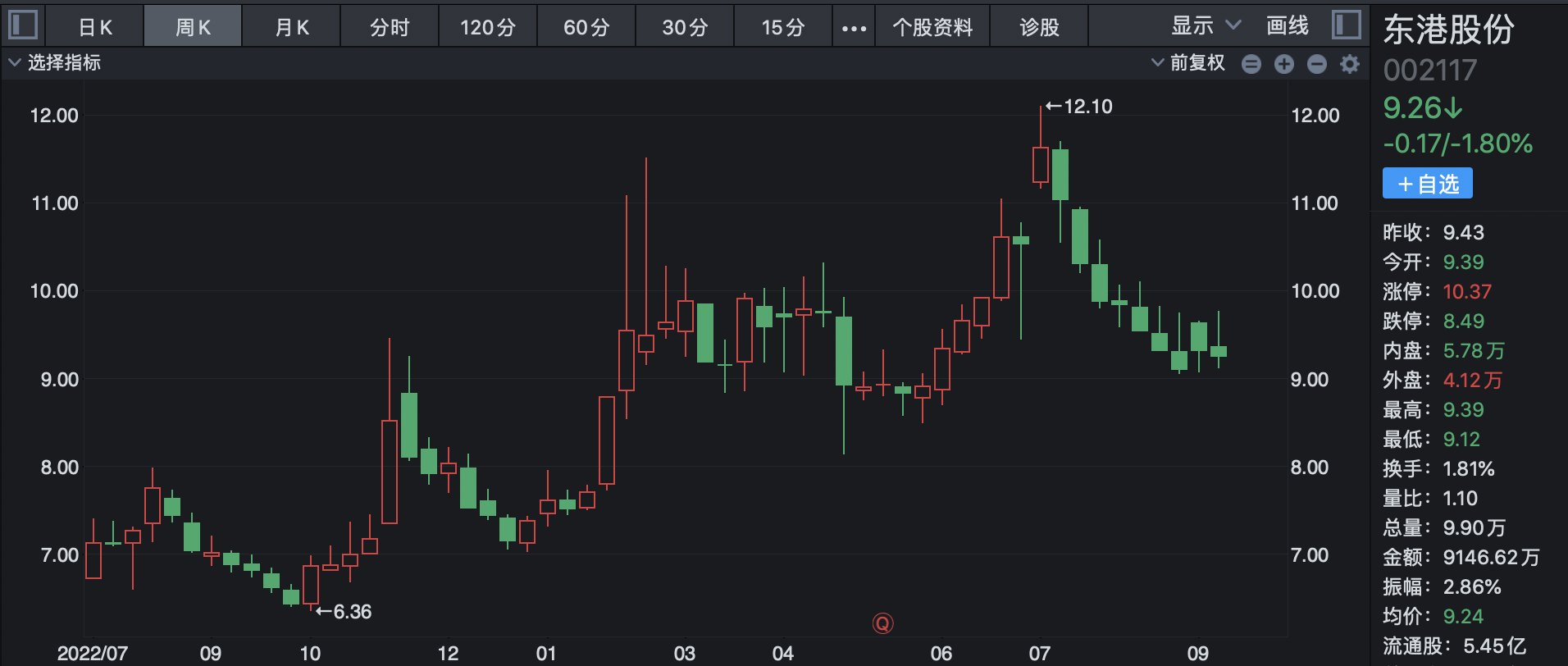 (东港股份股价走势周线图)