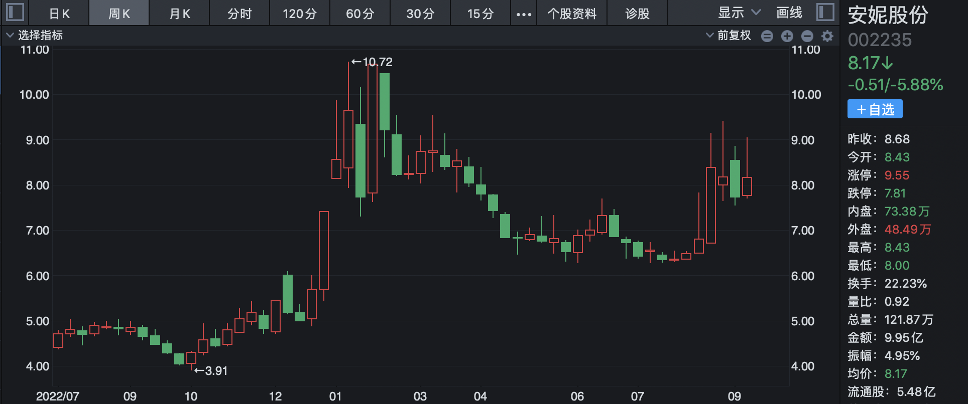 (安妮股份股价走势周线图)
