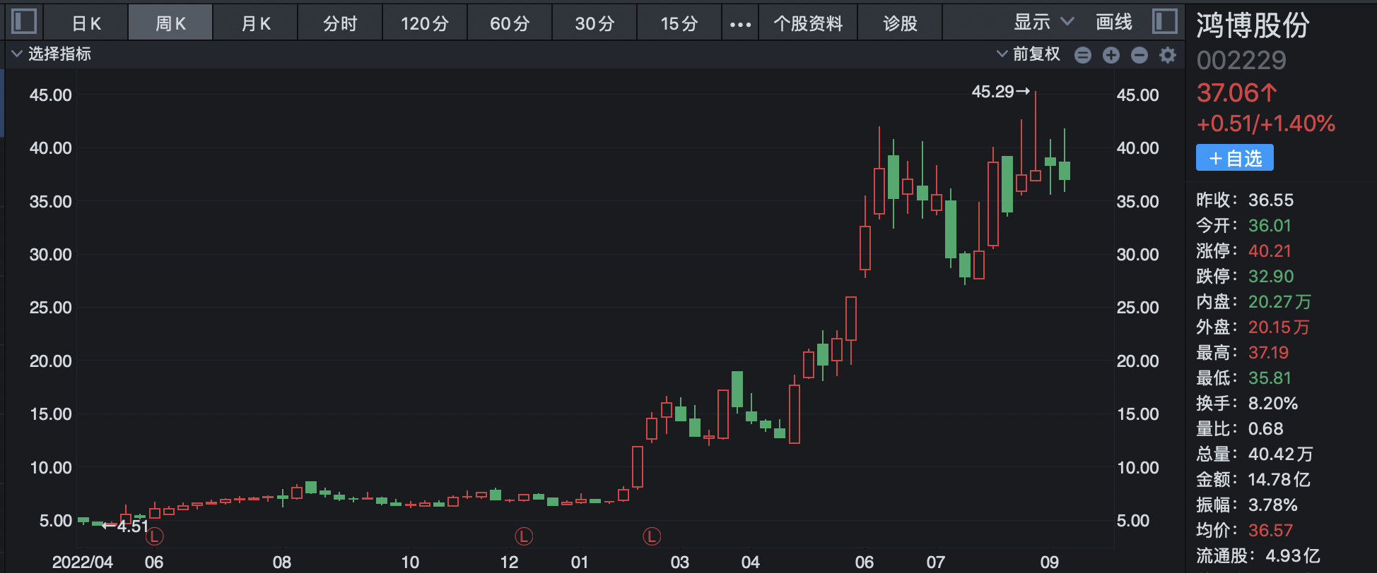 (鸿博股份股价走势周线图)