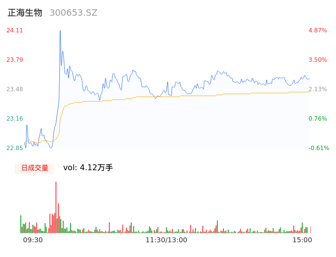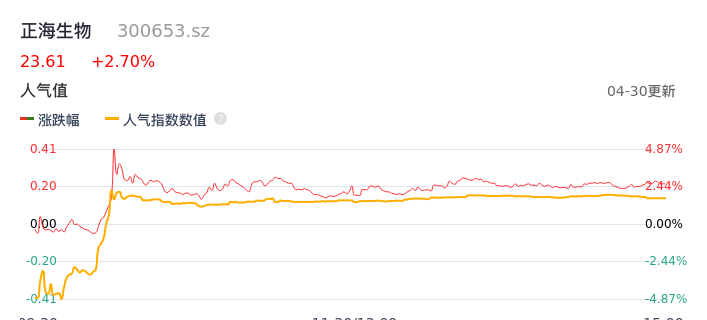 04月30日,正海生物收报23.61,股价涨幅2.70%,成交金额9674.25万元,换手率2.29%。