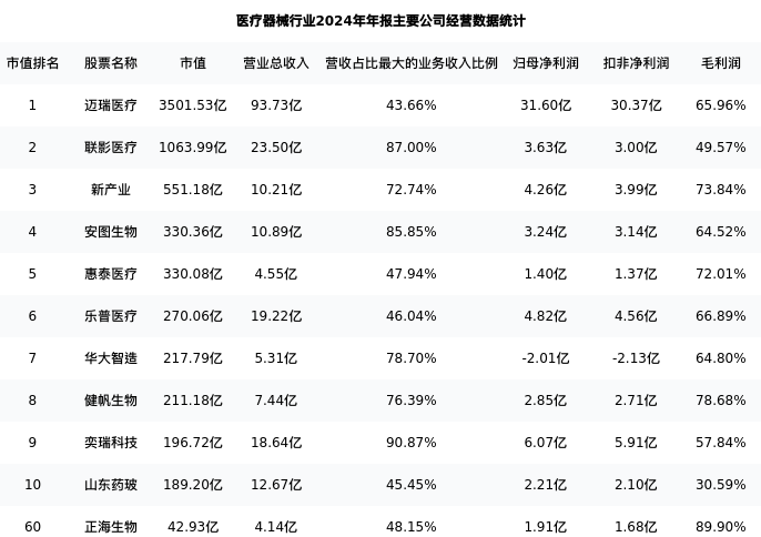 正海生物最新报告期数据为年报,下表汇总了医疗器械行业内市值靠前的公司年报主要经营数据