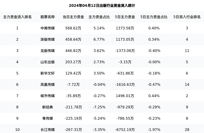 从主力资金流向来看,出版行业今日主力资金流入12.17亿元,在所有申万二级行业中排名:96/131。