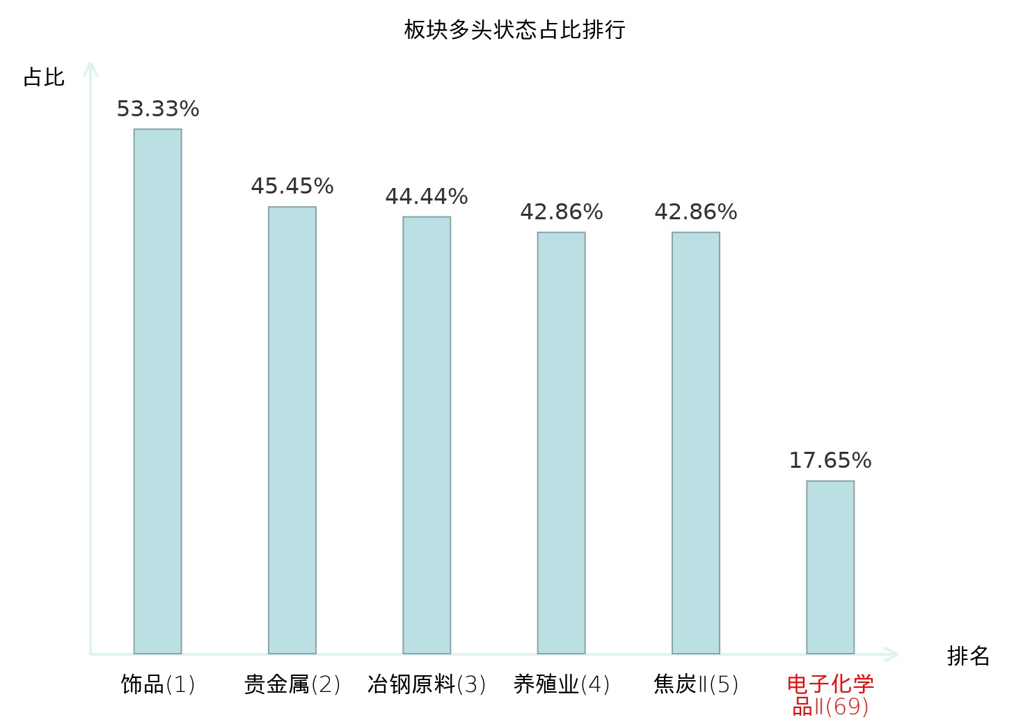 全市场所有行业板块中主力多头状态占比排名中,饰品板块位居第一。非金属材料Ⅱ板块名次提升最快,较昨日上升58位。