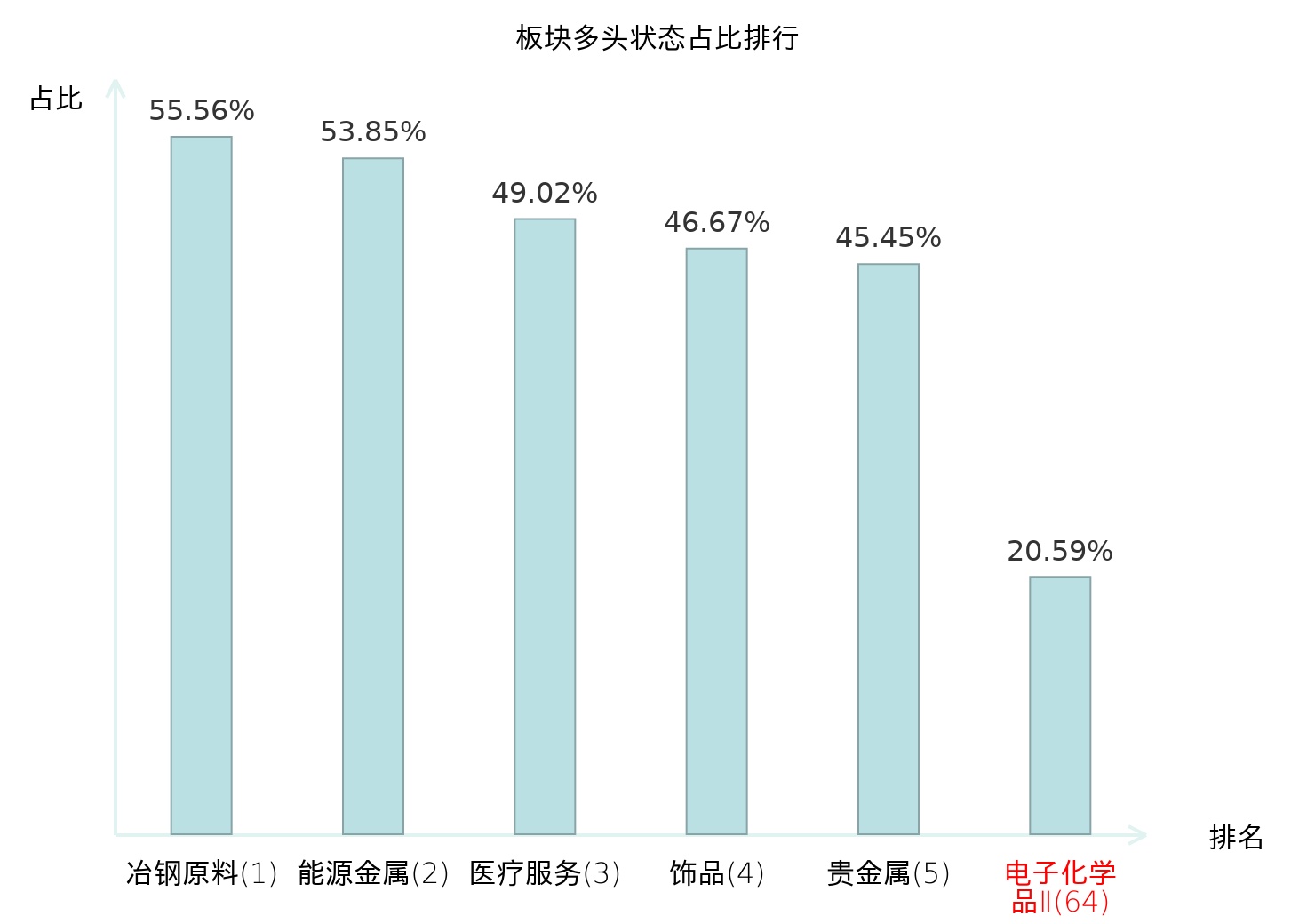 全市场所有行业板块中主力多头状态占比排名中,冶钢原料板块位居第一。能源金属板块名次提升最快,较昨日上升89位。