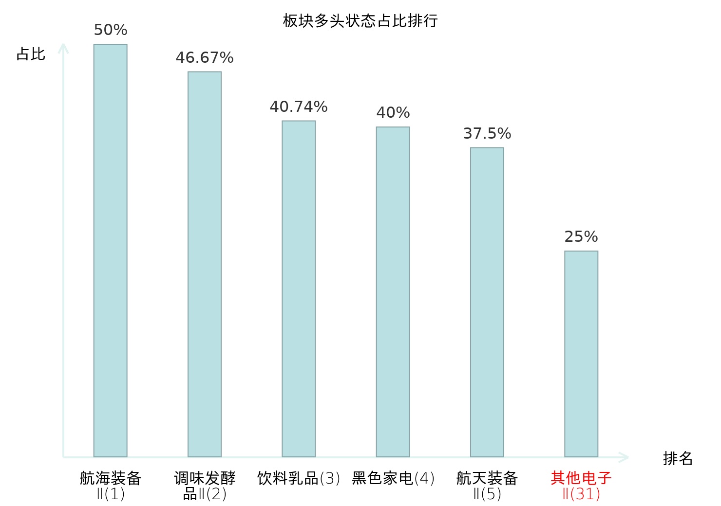 全市场所有行业板块中主力多头状态占比排名中,航海装备Ⅱ板块位居第一。航海装备Ⅱ板块名次提升最快,较昨日上升99位。