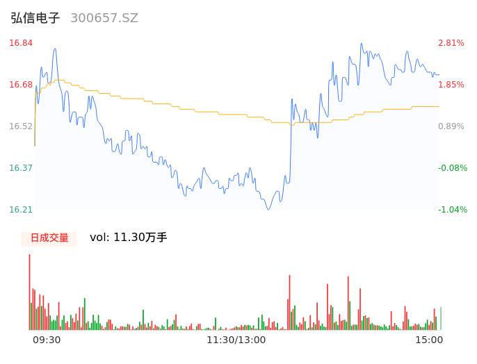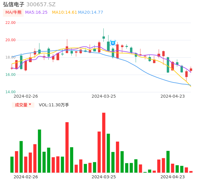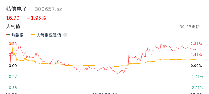 04月23日,弘信电子收报16.70,股价涨幅1.95%,成交金额1.88亿元,换手率2.44%。