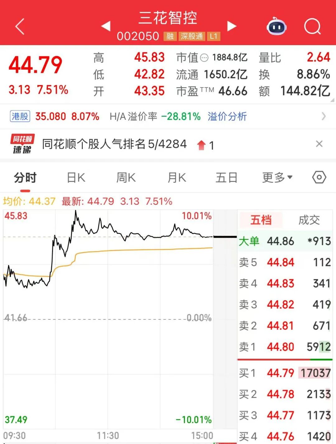 今日,人形机器人热门股三花智控获得主力资金净流入超26亿元,位居同花顺主力净流入榜单第一名。截至收盘,该股报44.79元/股,A股总市值达1884.8亿元。同花顺数据显示,今年以来,该股股价涨超90%。