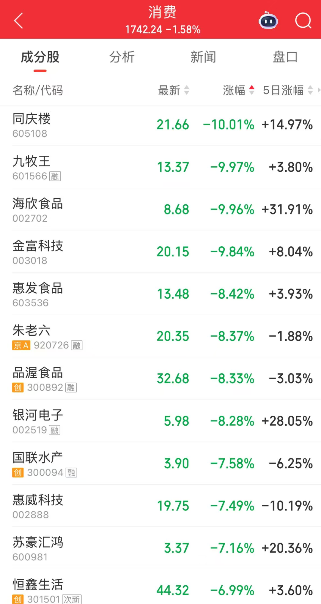 同庆楼海欣食品等前期大涨股均跌停。惠发食品朱老六品渥食品等跌幅居前。