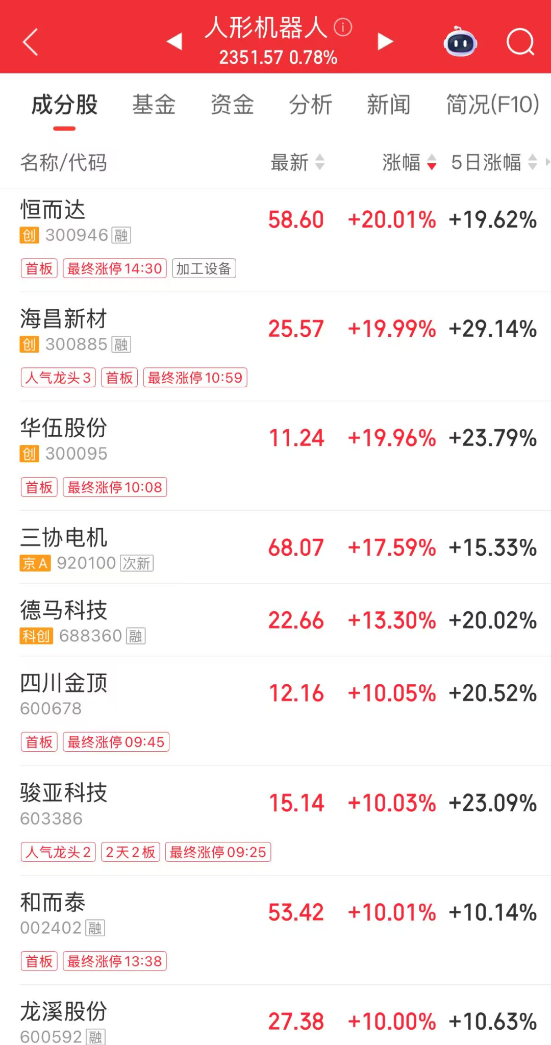 今日,人形机器人板块走强,恒而达海昌新材华伍股份均“20CM”涨停,四川金顶骏亚科技和而泰等多股涨停。