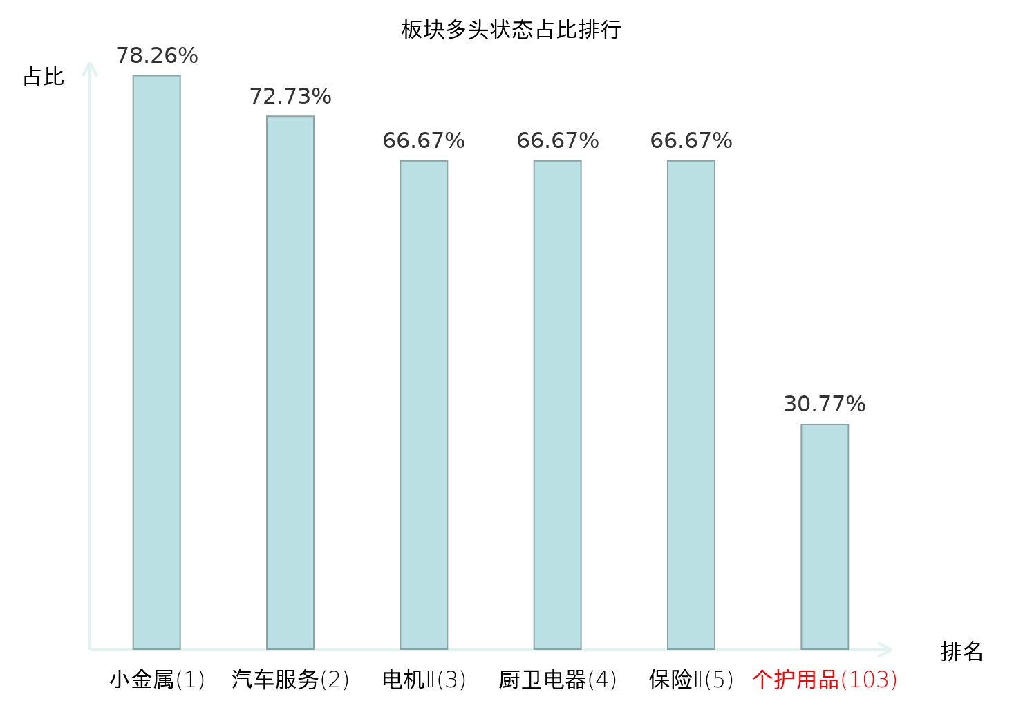 全市场所有行业板块中主力多头状态占比排名中,小金属板块位居第一。农业综合Ⅱ板块名次提升最快,较昨日上升88位。