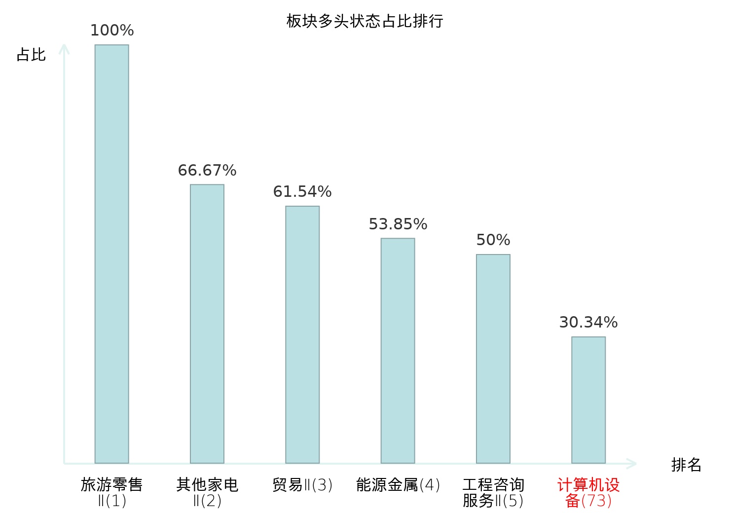 全市场所有行业板块中主力多头状态占比排名中,旅游零售Ⅱ板块位居第一。冶钢原料板块名次提升最快,较昨日上升37位。